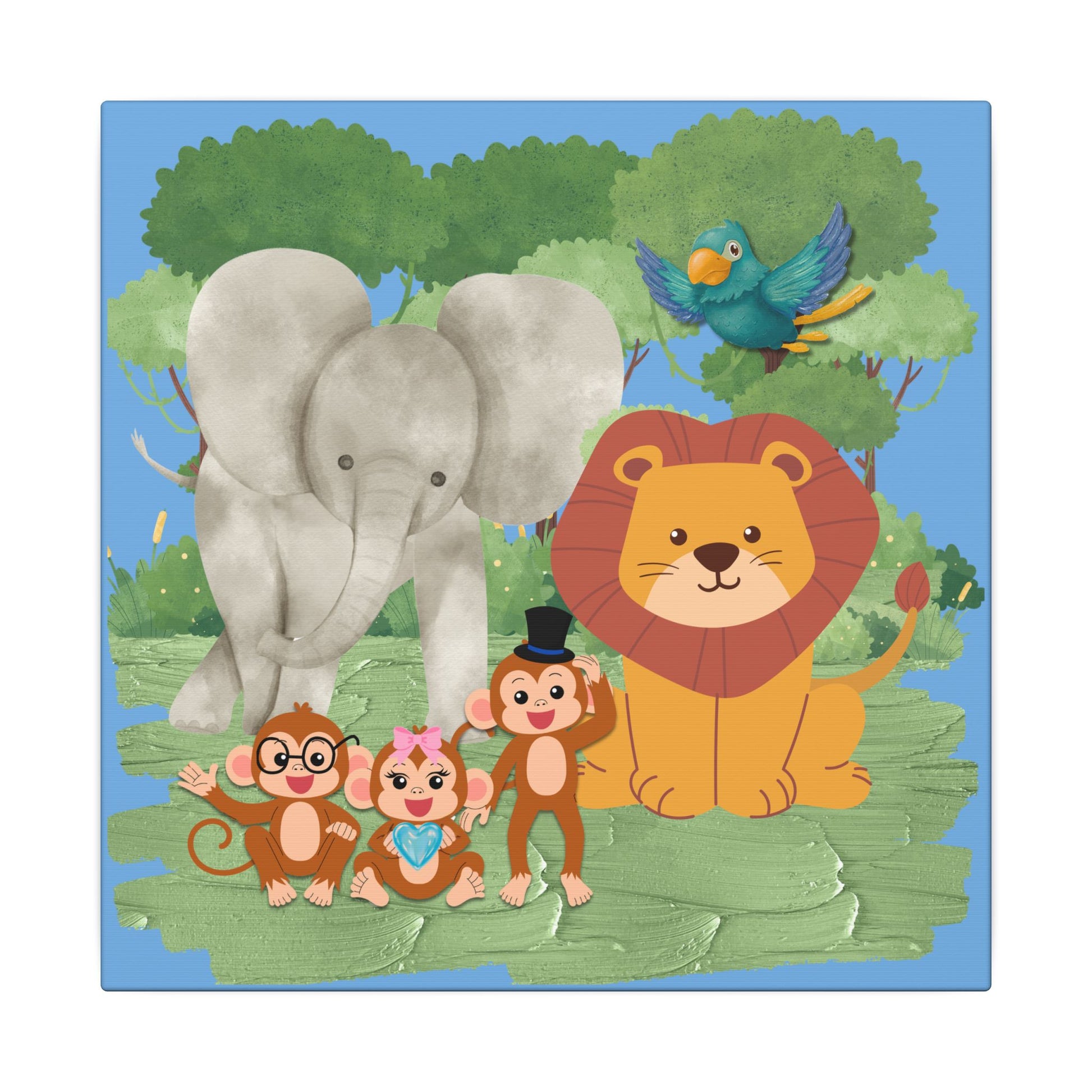 Bring a playful slice of the jungle into a child’s room with this matte stretched canvas. Soft, friendly illustrations of a lion, elephant, three curious monkeys and a cheerful bird gather beneath shady trees — a calm, colorful scene that encourages imagination during storytime and quiet moments. The muted matte finish reduces glare, making the art feel cozy and approachable on nursery or playroom walls. Lightweight yet sturdy, the stretched canvas sits slightly proud from the wall, creating subtle depth that complements shelves, framed photos, or a reading nook. It’s art that reads as gentle and adventurous, inviting little explorers to dream up new stories each day.